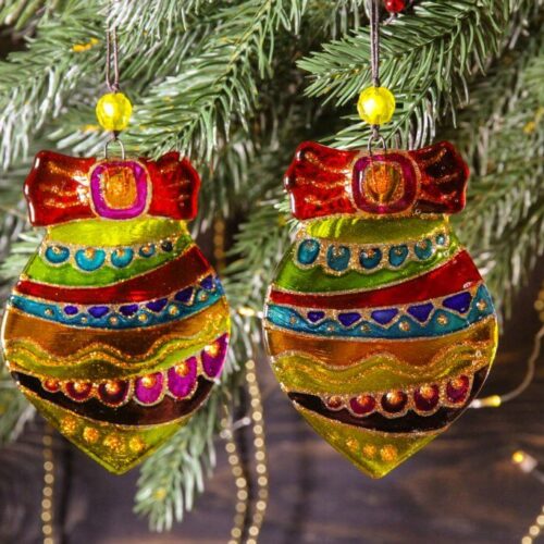 Set of 5 Christmas ornaments, colorful relief hanging tree décor made of fused glass, hand-painted by unique author’s design with using special stained-glass paints and shimmers. Can be used as wall hanging or interior decoration.