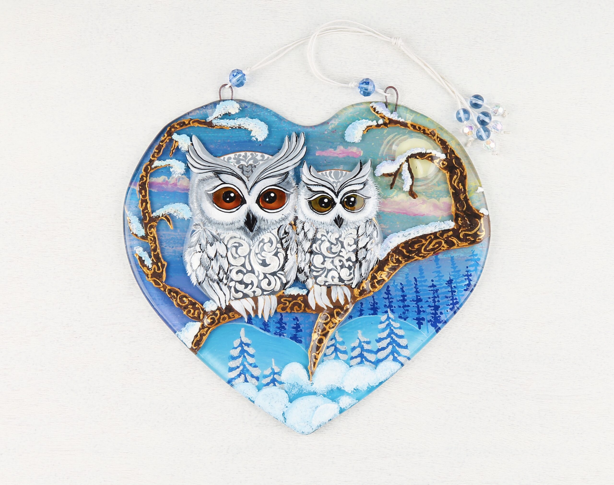 Romantic Owls big bright relief wall hanging made of fused glass, hand-painted by unique author’s design with using special stained-glass paints and shimmers.